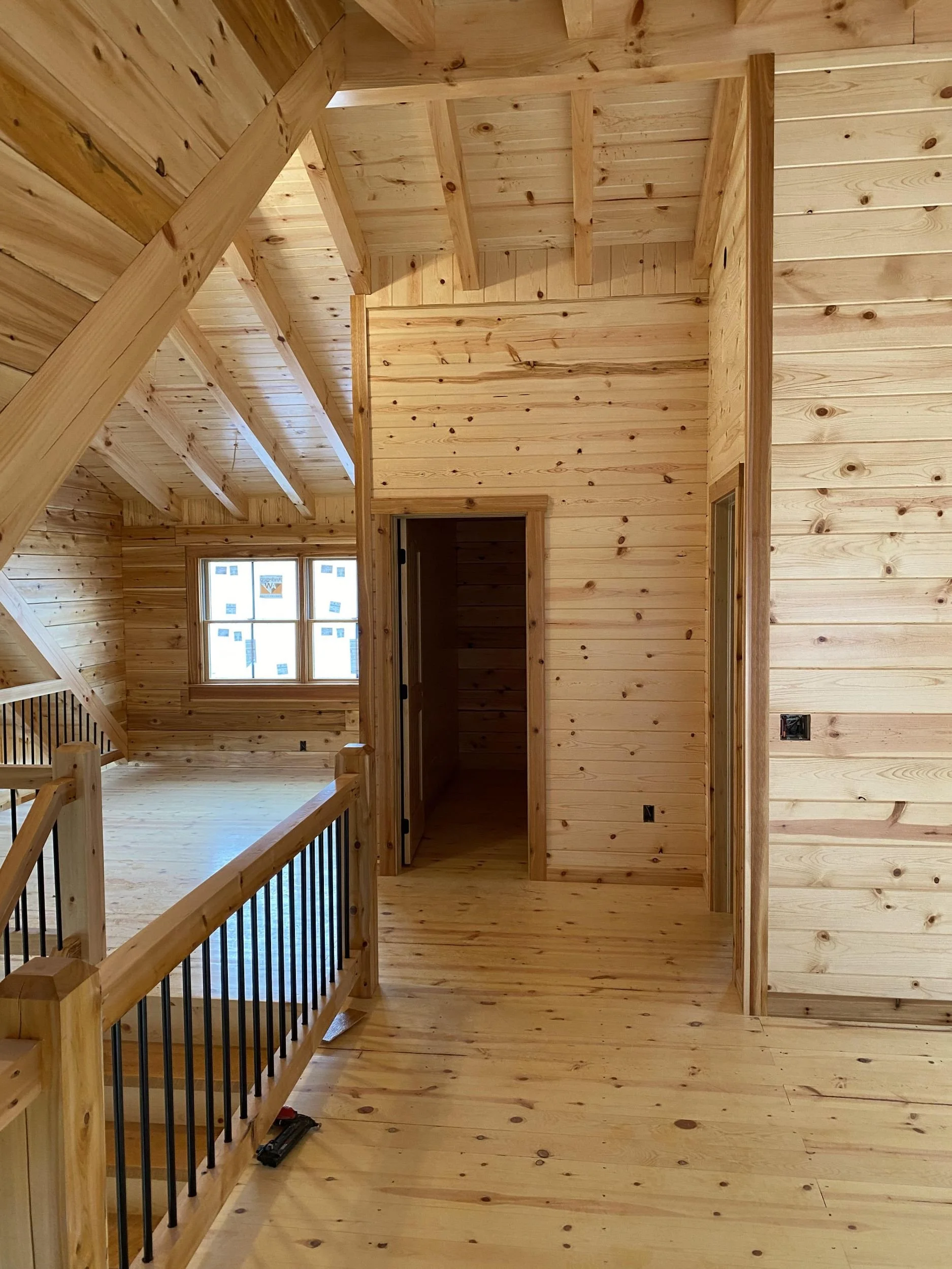 The interior photos feature the gorgeous front door package, as well as the hand crafted stairway and open loft area. This home has alllll the cozy wood feels!