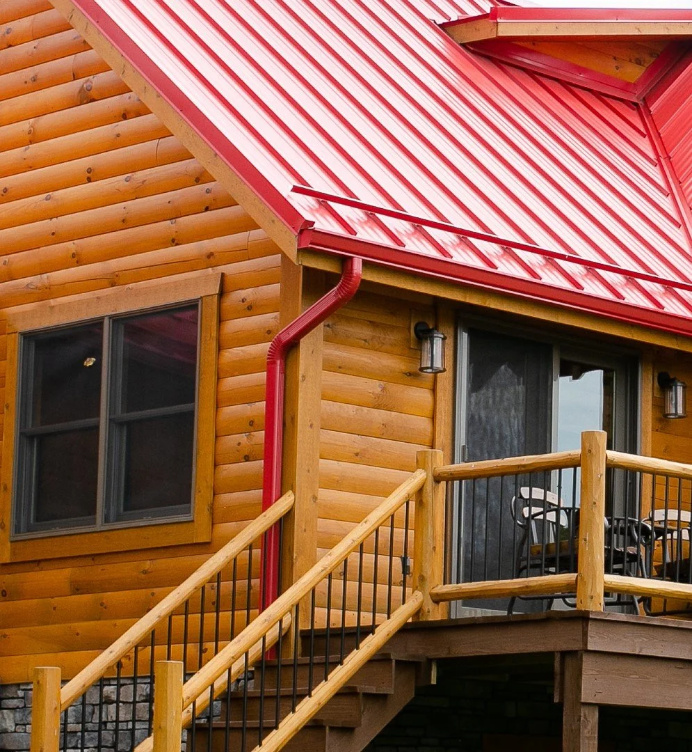 Log Corner Post with D Logs - Log Home with Red Metal Roof