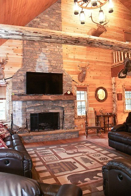 There are very few things that go hand-in-hand like a log home and a stone covered fireplace. They truly are a timeless focal point that adds such a great dimensional feature the Great Room.