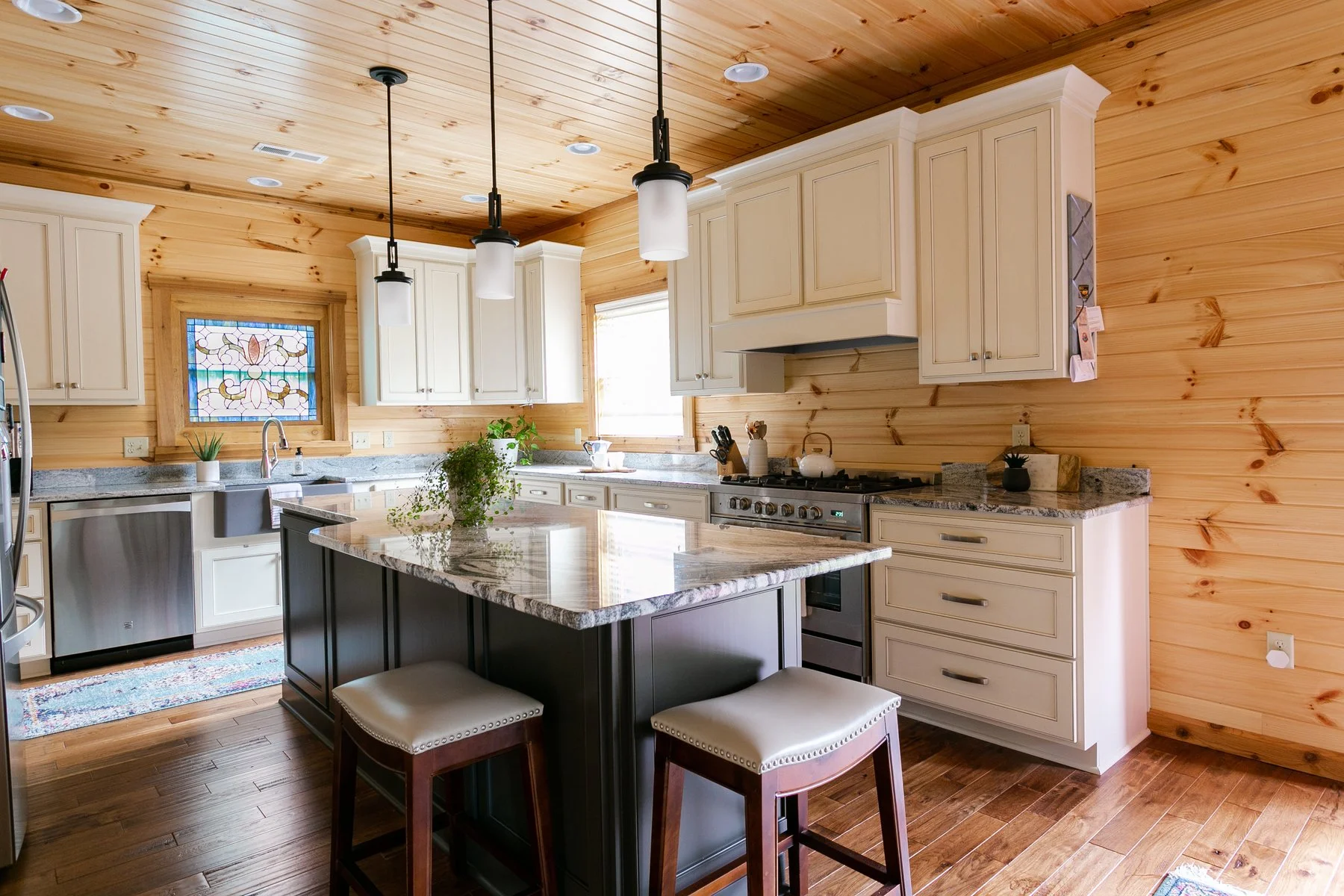 Log Home Kitchen with Custom Cabinetry and Graphite Appliances
