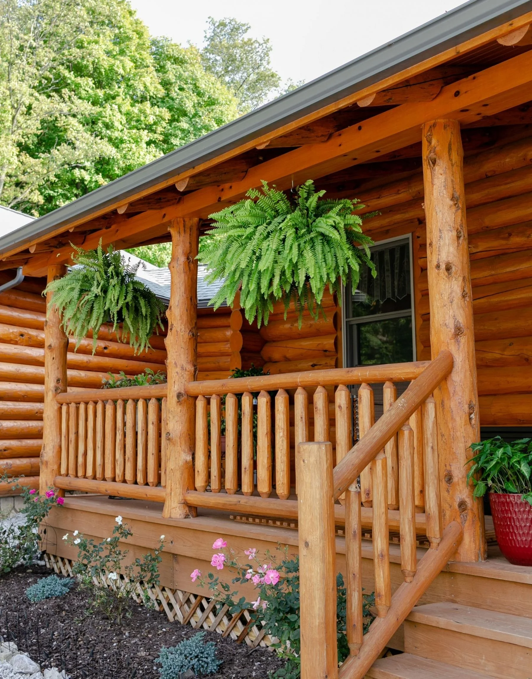Cedar Log Railing and Spindles on Front Porch of Log Home