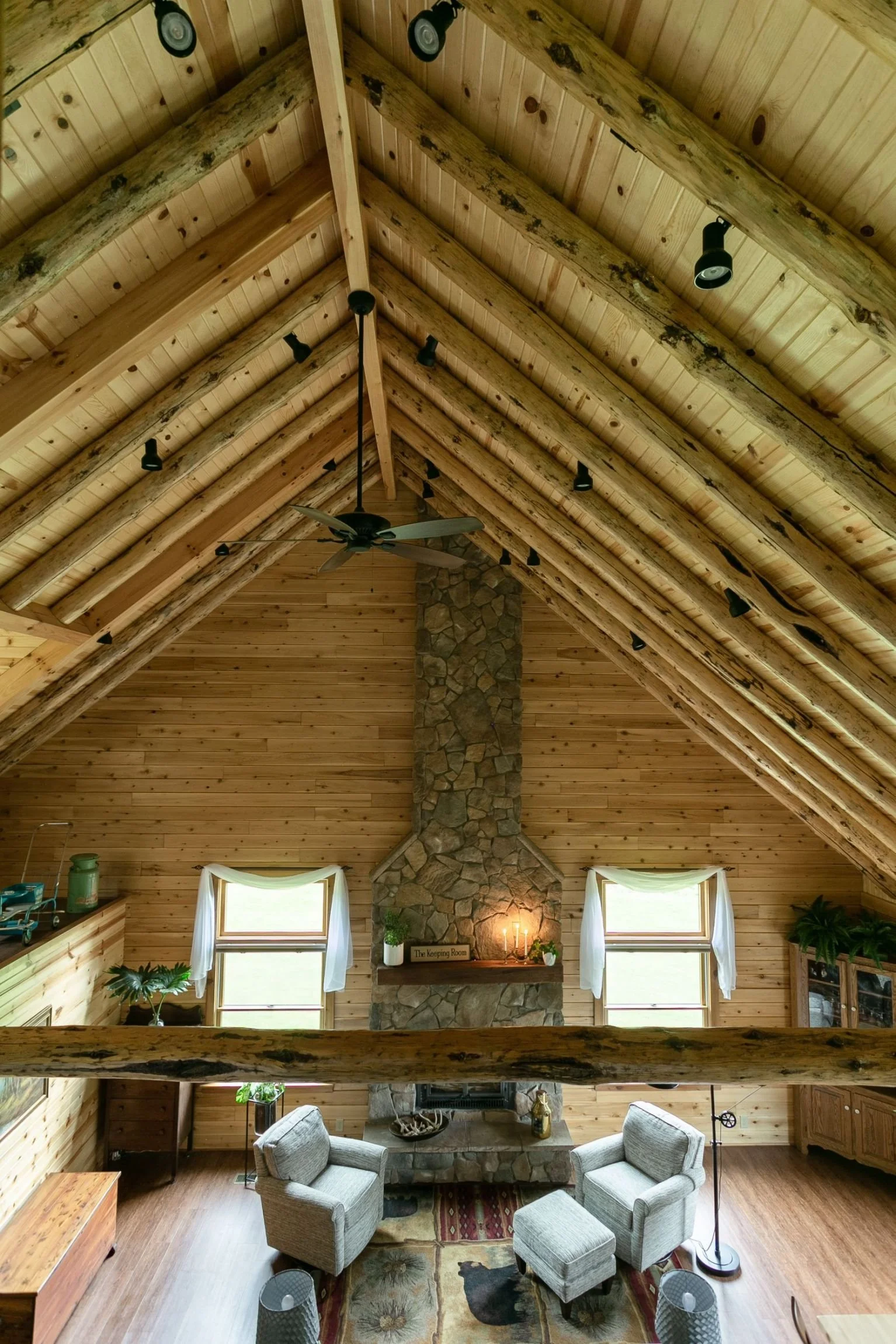Insulated Log Roof System with Square Rafters and Tongue and Groove Barn Siding Ceiling