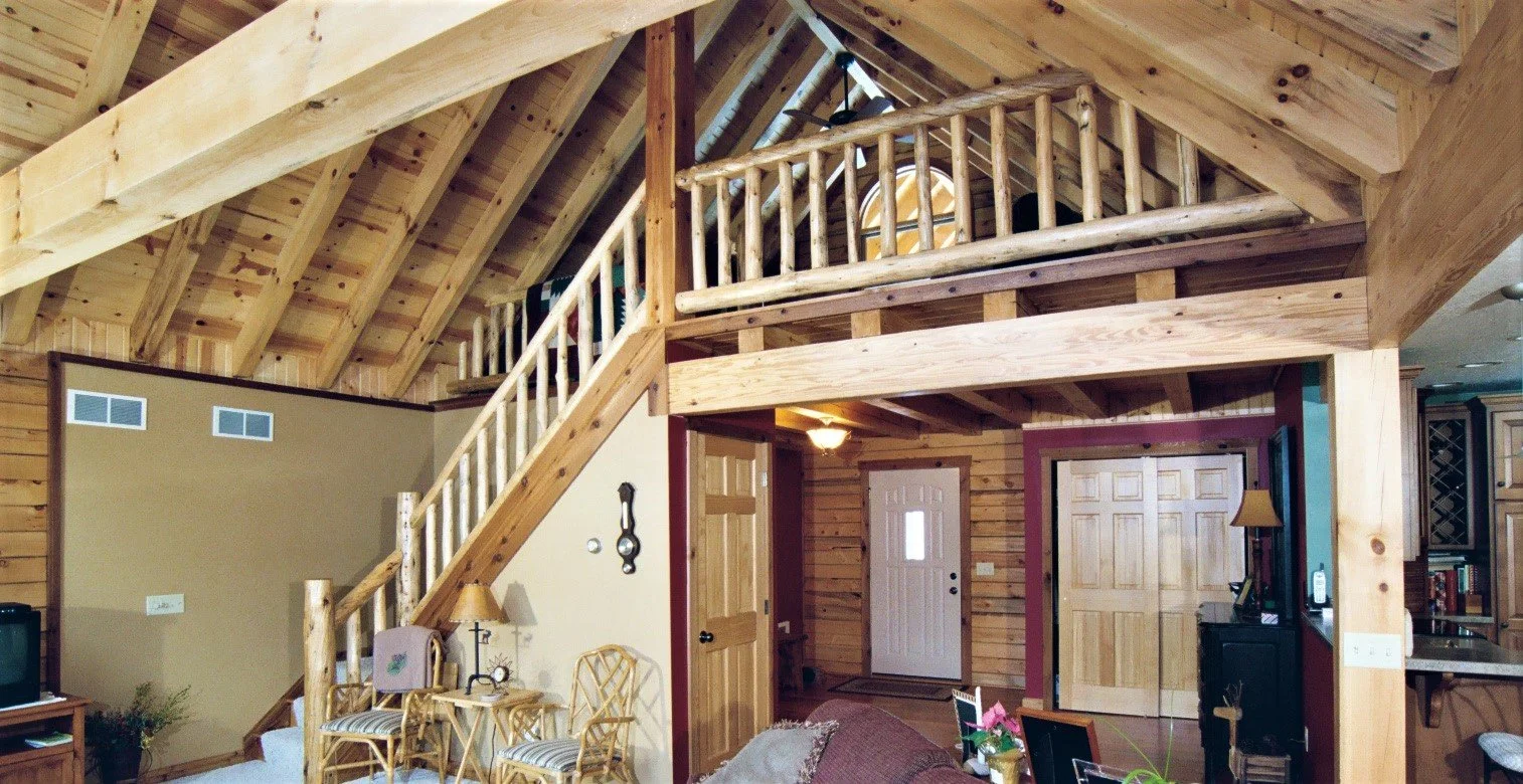 Standard conventional stair way in log home Log railing lining the stairs and loft edge