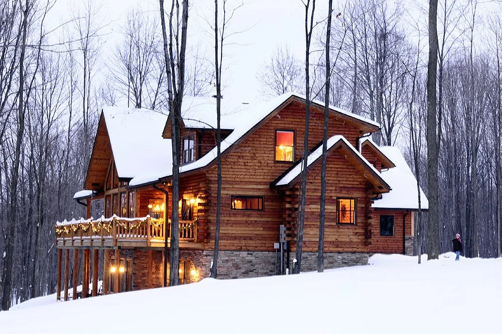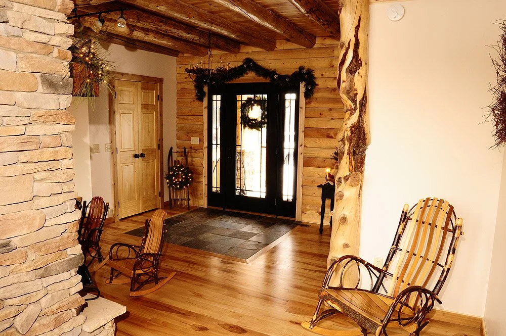 The Gibson Log Home is located in Northern Ohio in a wooded lot on 2.3 acres and is built with 6"x 8" Milled D Pine logs and Round Rustic Rafters and Joists. It also includes a 2 car garage with a finished bonus room above.