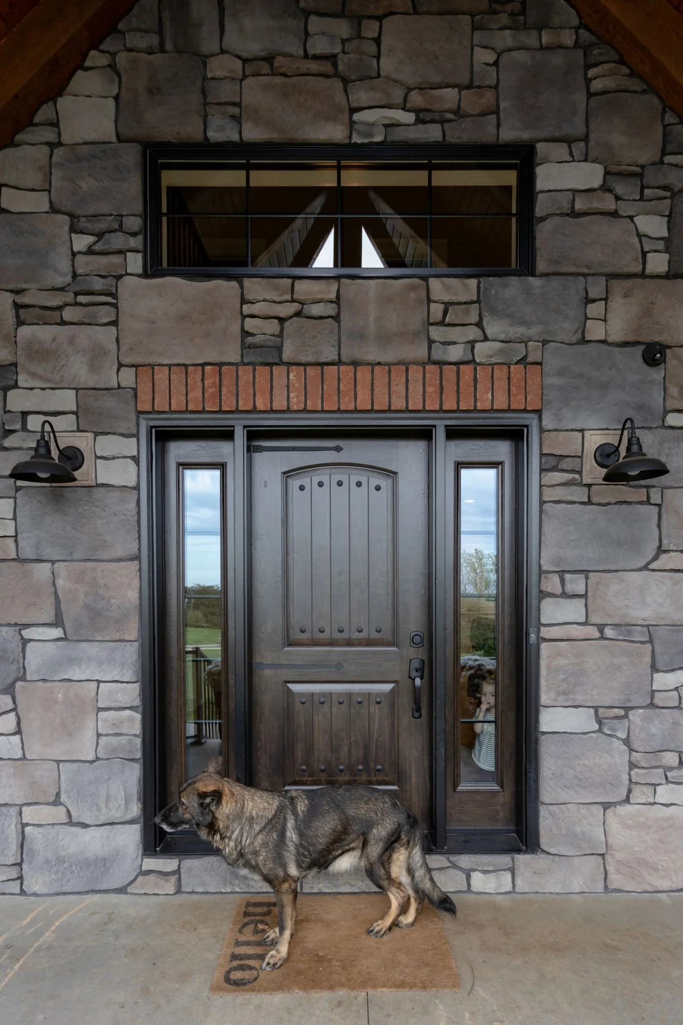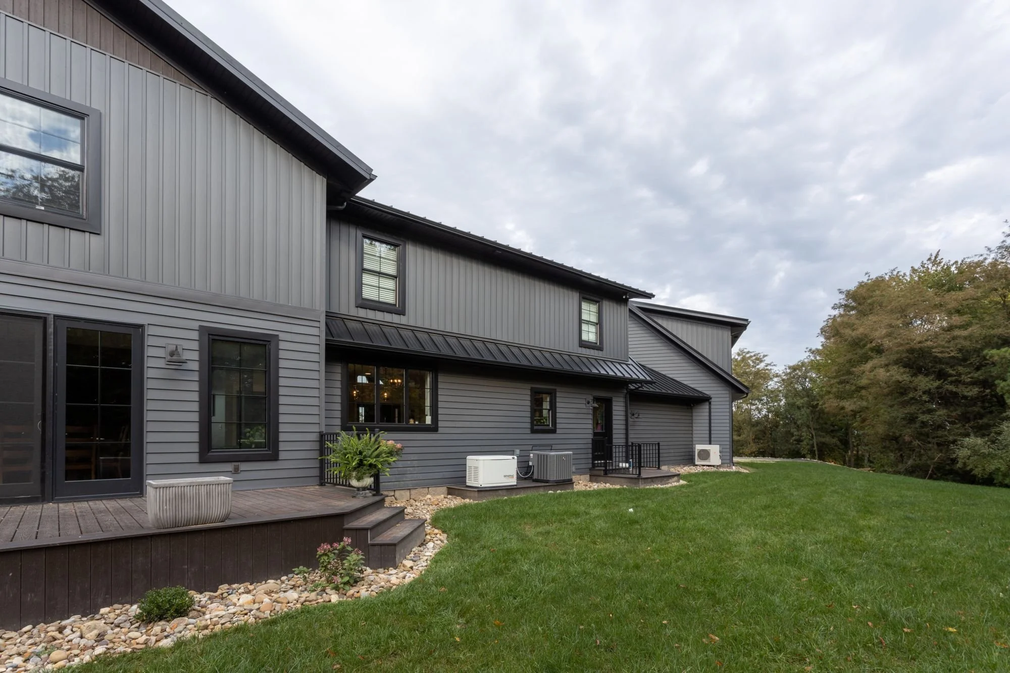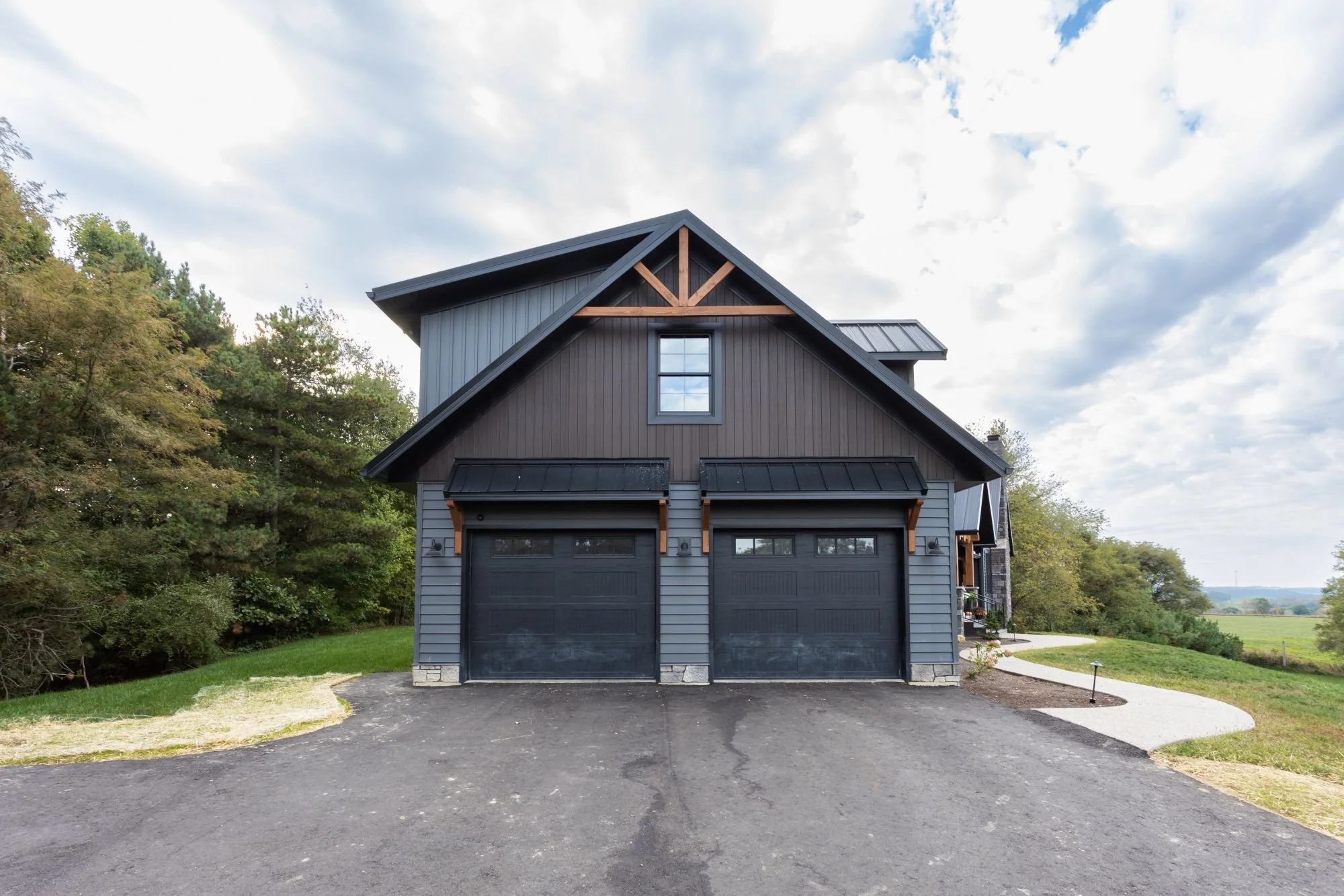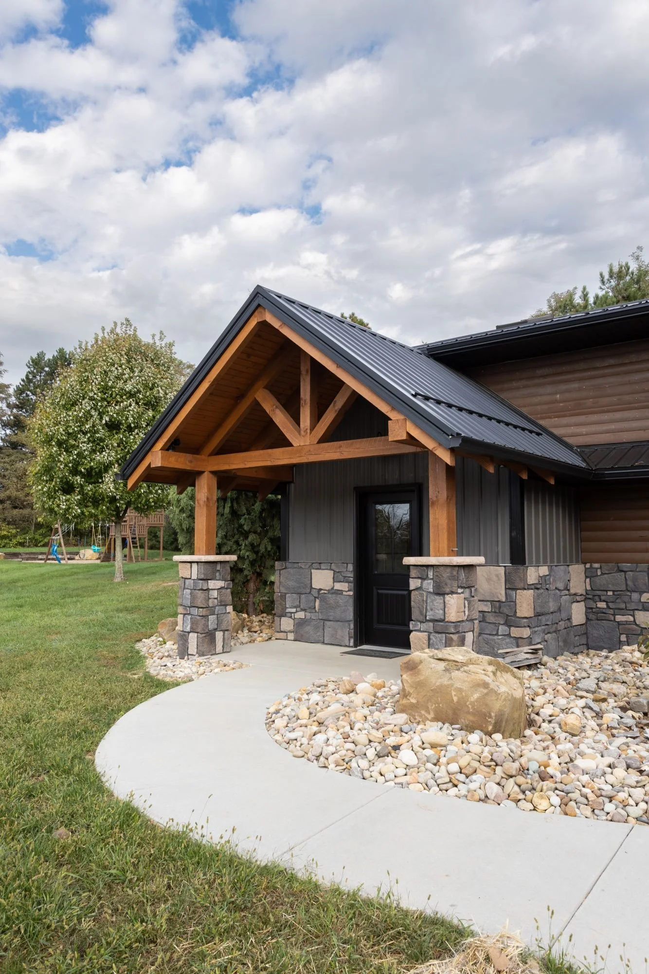 This beautiful hybrid timber frame home built in the hills of Ohio features oak trusses in the great room, as well as the front entry. The dark vinyl exterior pairs well with the stained woodwork throughout the exterior.