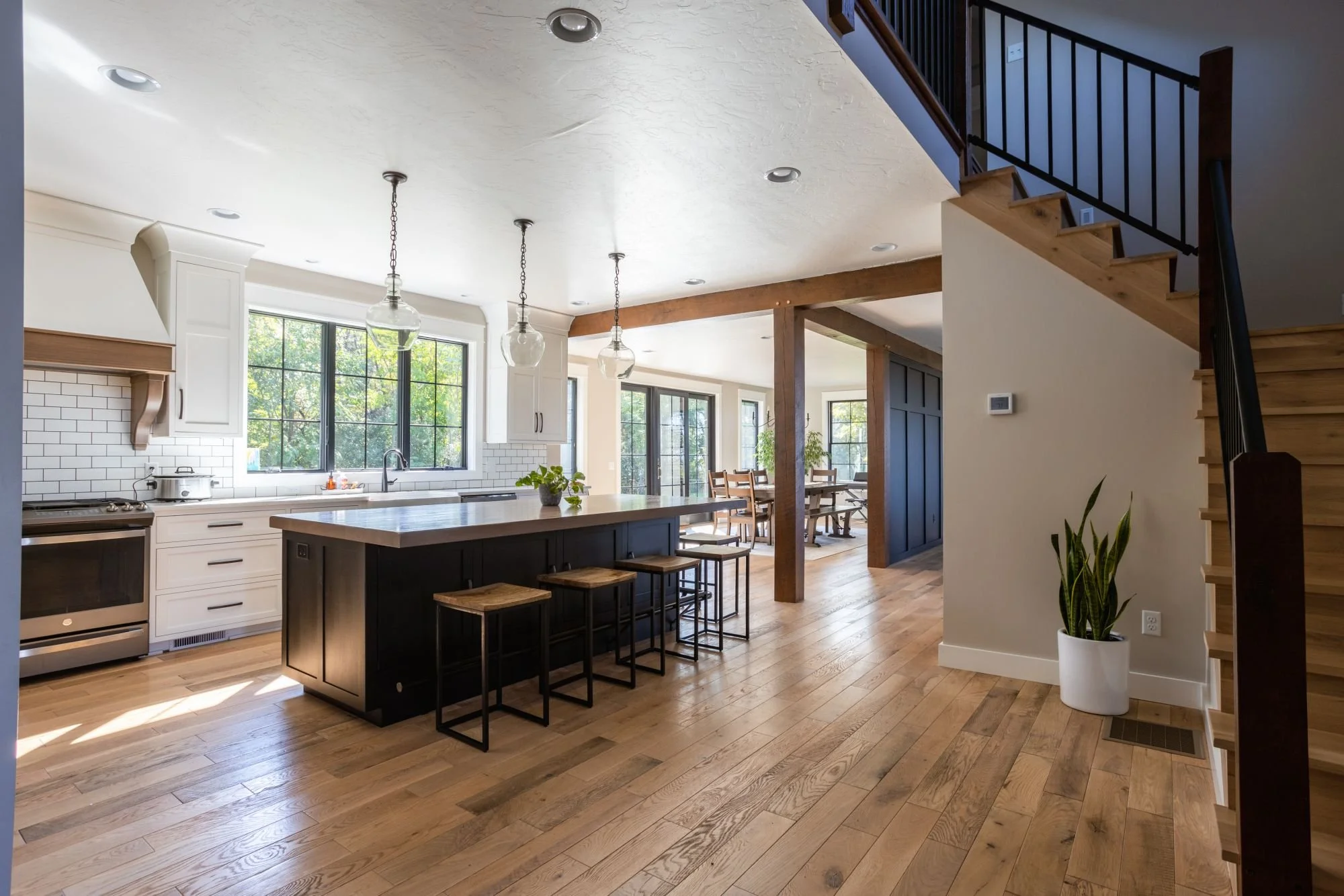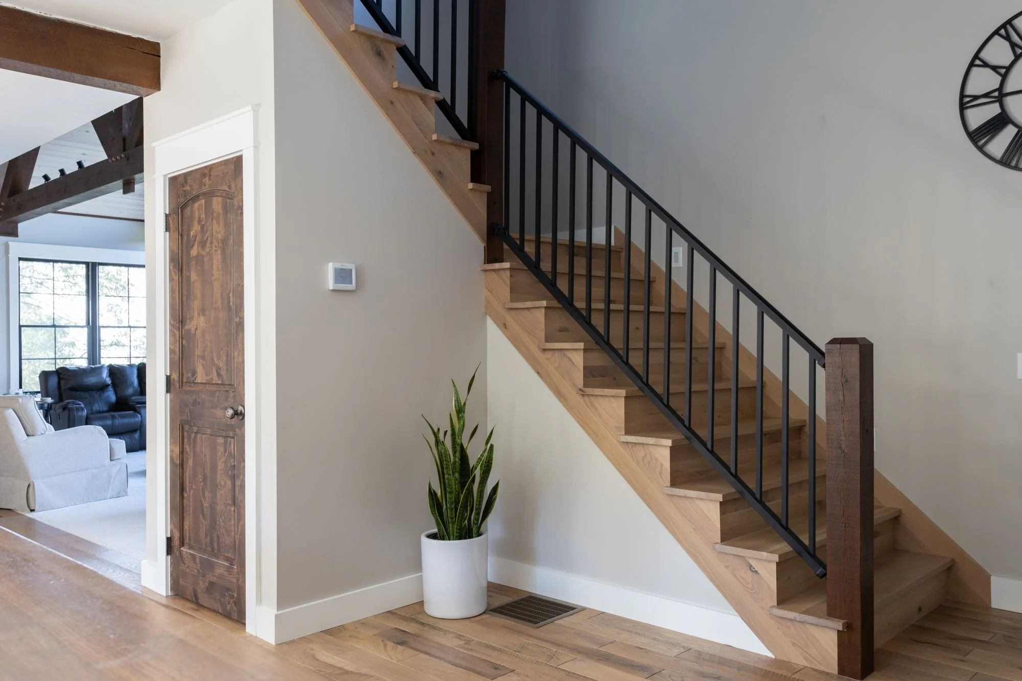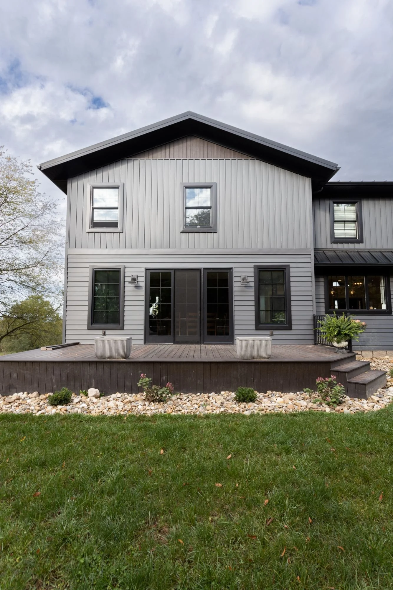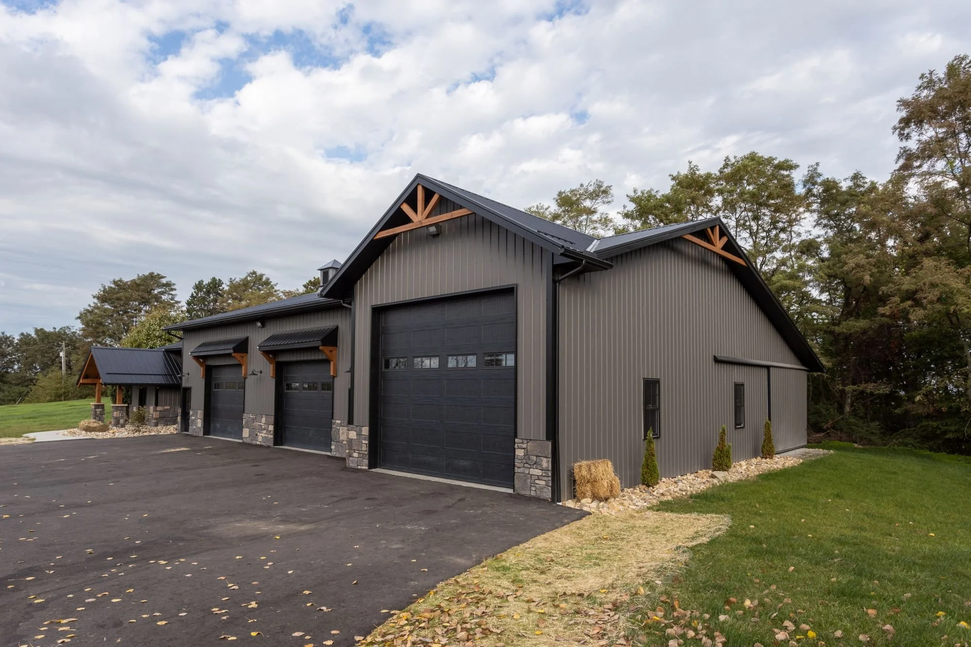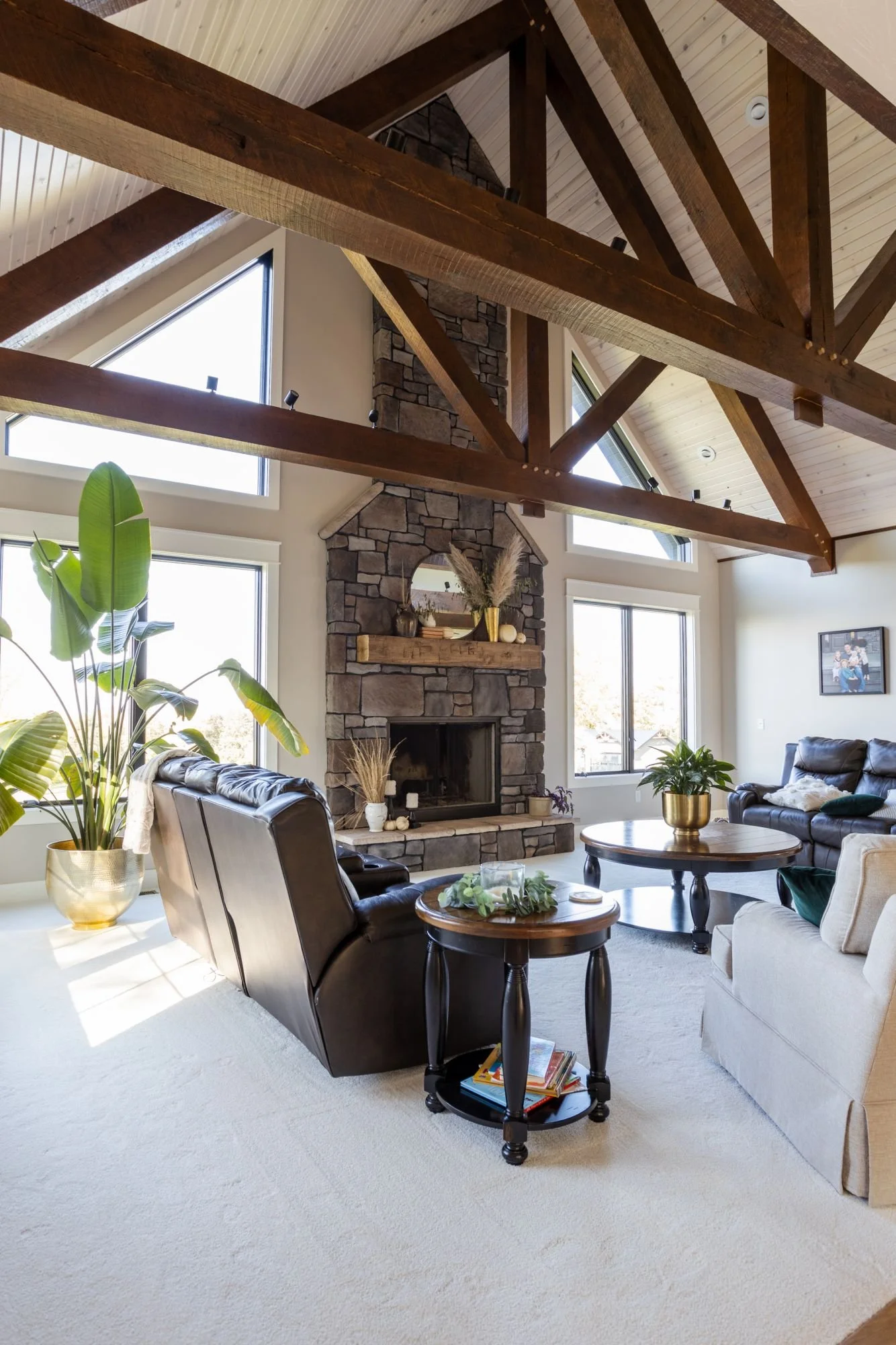 This beautiful hybrid timber frame home built in the hills of Ohio features oak trusses in the great room, as well as the front entry. The dark vinyl exterior pairs well with the stained woodwork throughout the exterior.