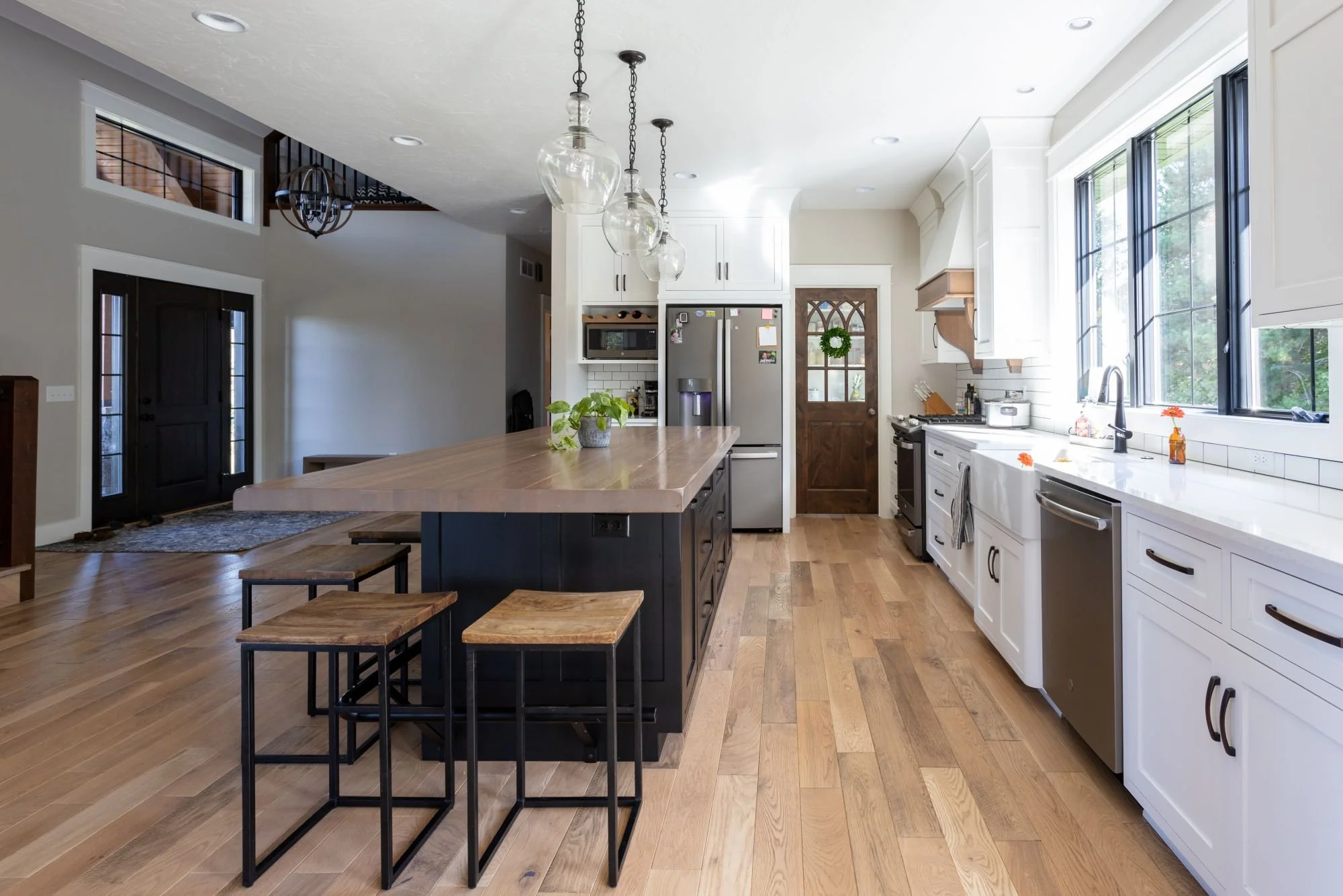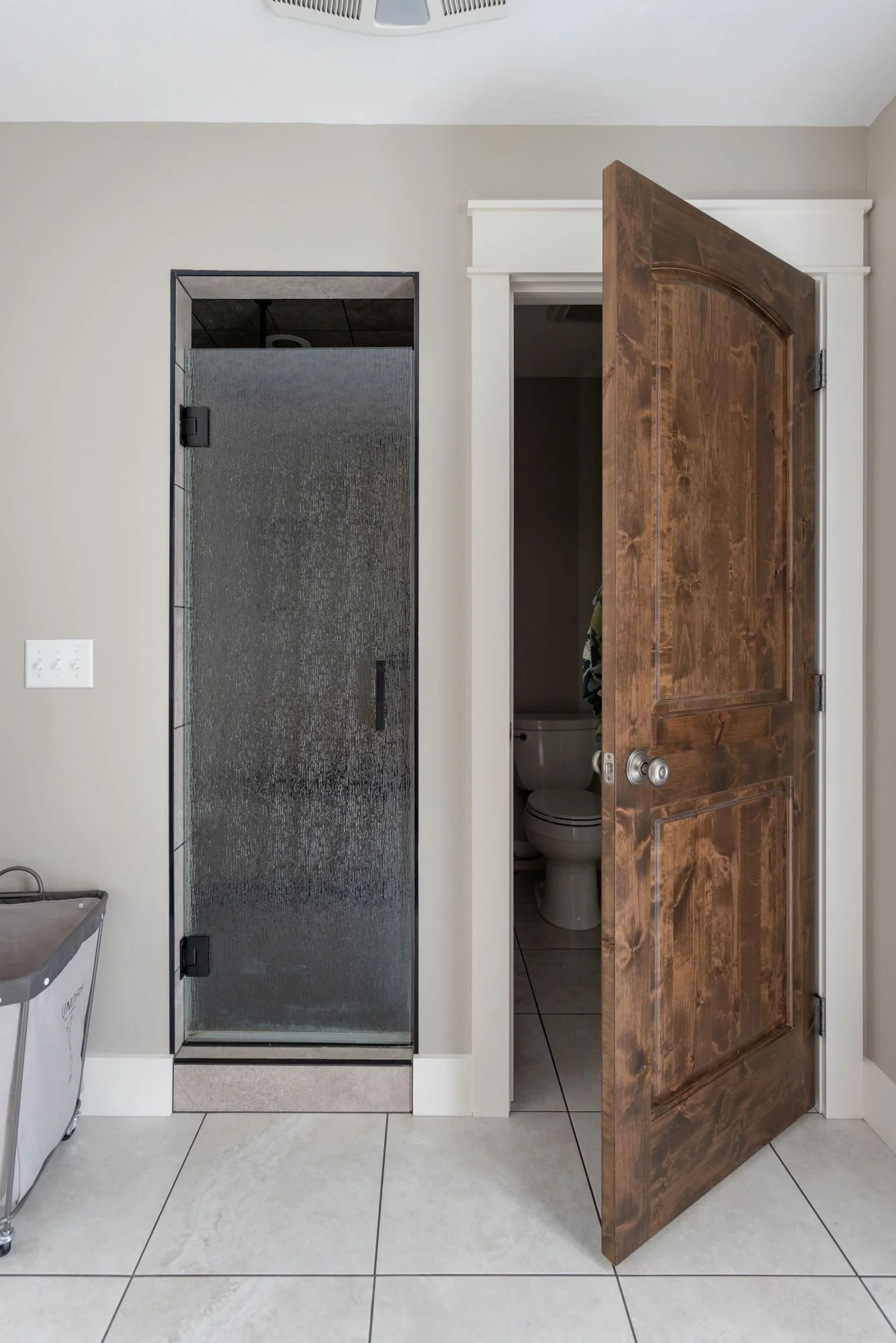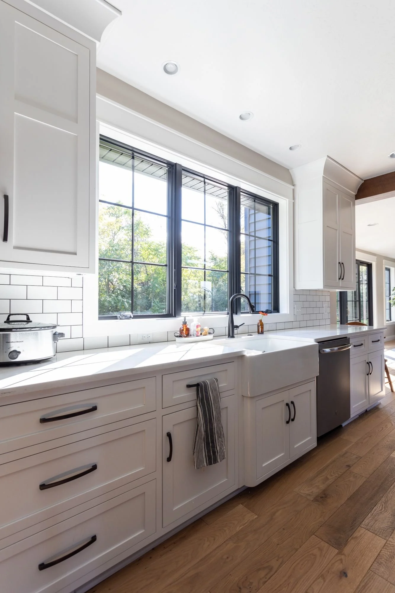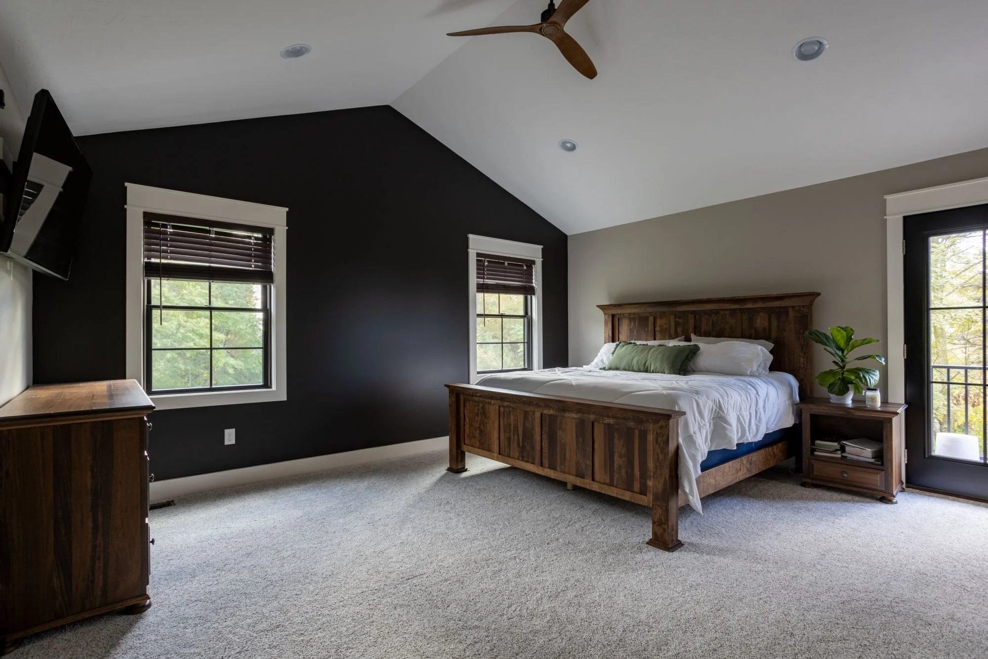 This beautiful hybrid timber frame home built in the hills of Ohio features oak trusses in the great room, as well as the front entry. The dark vinyl exterior pairs well with the stained woodwork throughout the exterior.