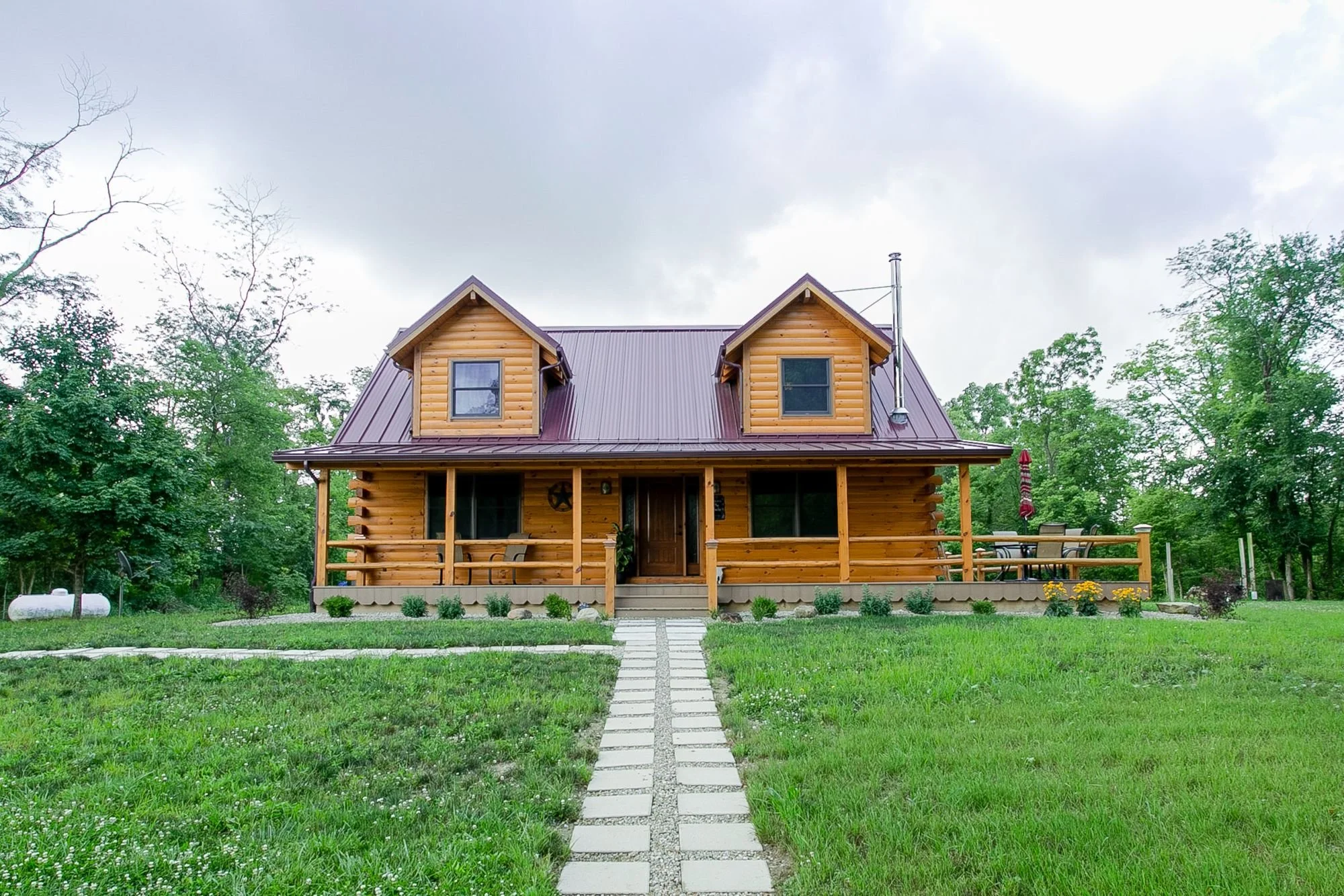 Another classic log home in the books! This 1600 square foot log home is built with 8" x 6" Eastern White Pine on a block foundation and topped with a burgundy standing seam metal roof. The property has plenty of outdoor living space with two 8' x 38' covered porches (front and back) connected by a 10' x 14' open deck! With the privacy of trees and the shade of the porch roofs, our clients can enjoy the country air as often as they want.