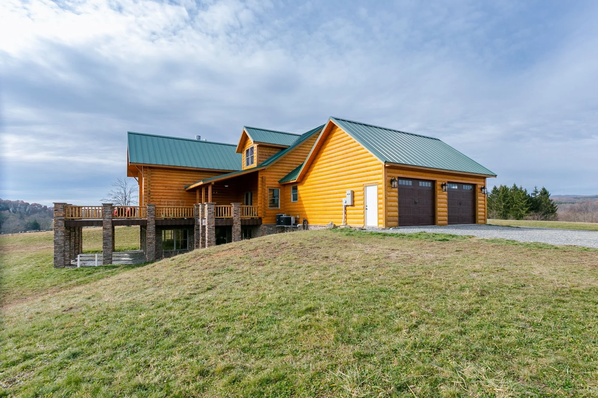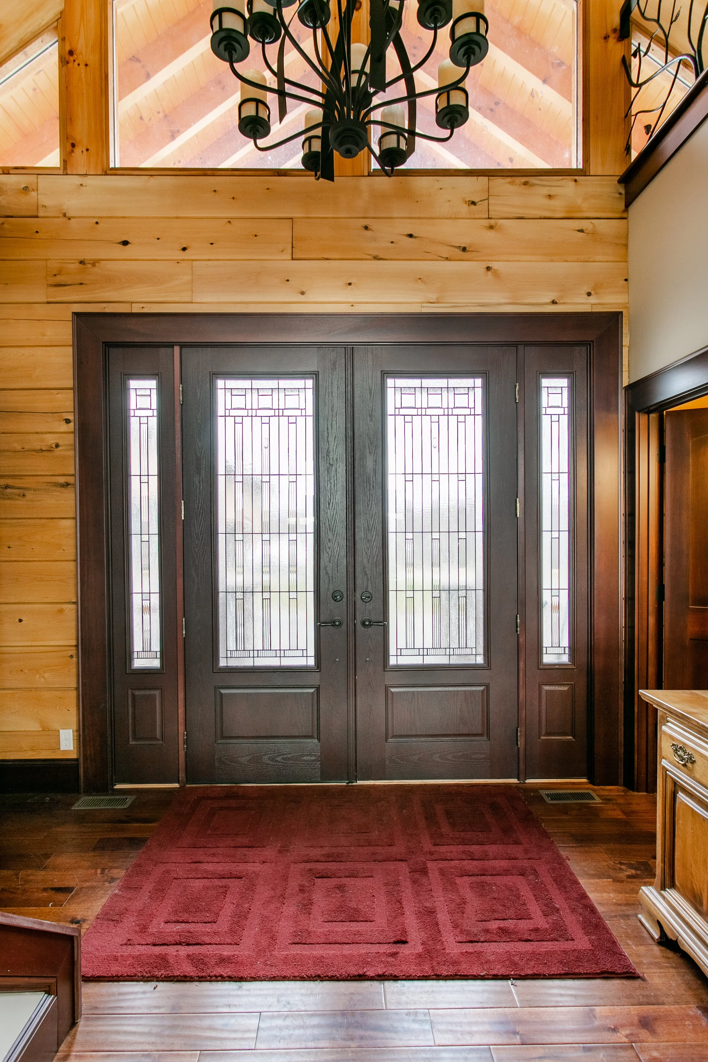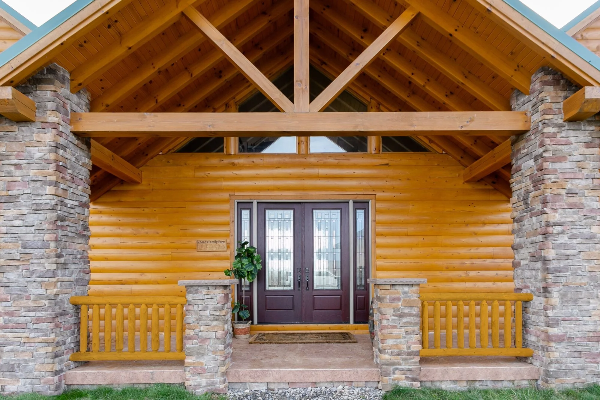 This stately log home is built with 10" x 8" White Cedar "D" Logs with Saddle Notched Corners. The foundation and deck support pillars are covered with a beautiful stone veneer that accents the log walls perfectly.