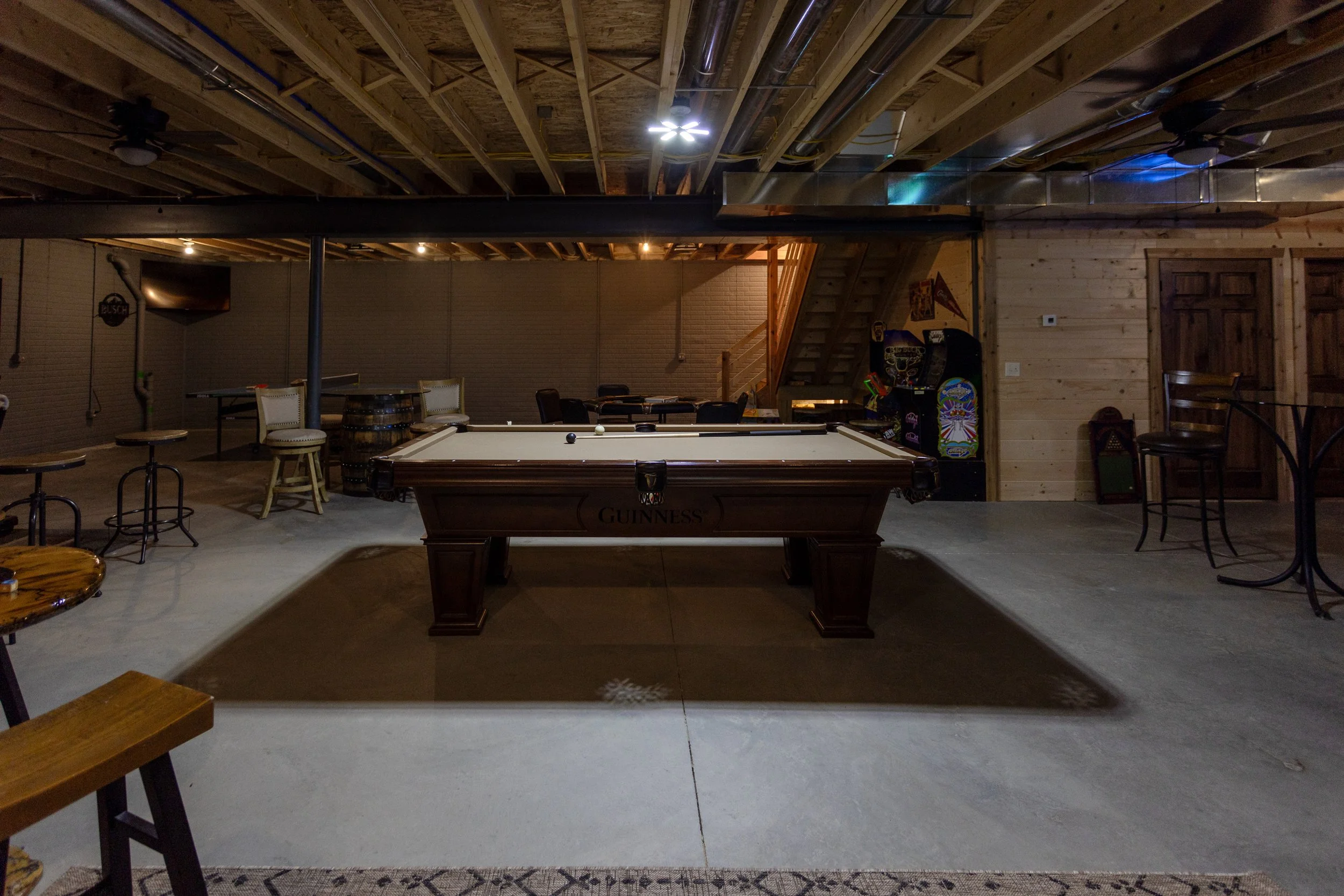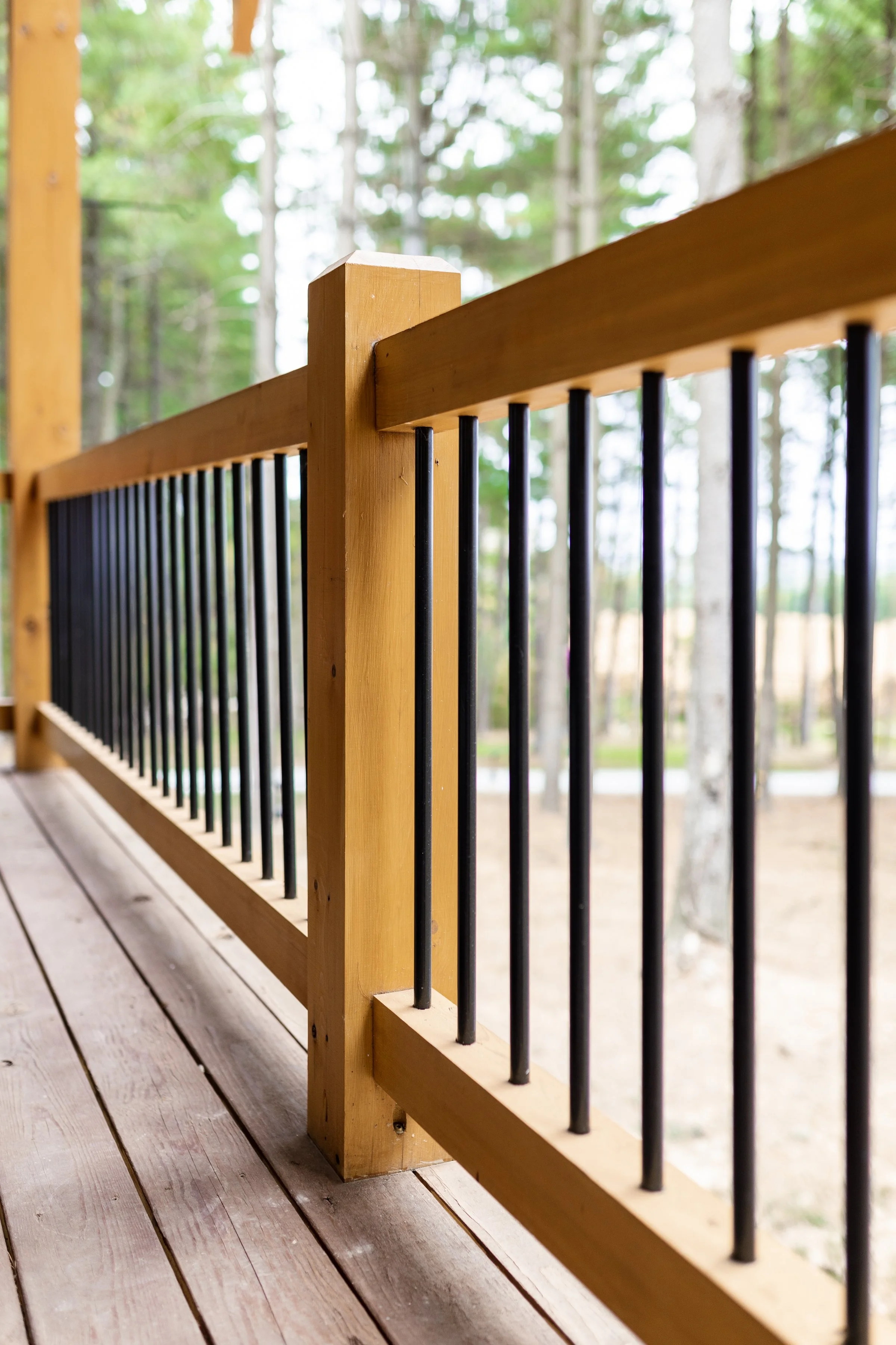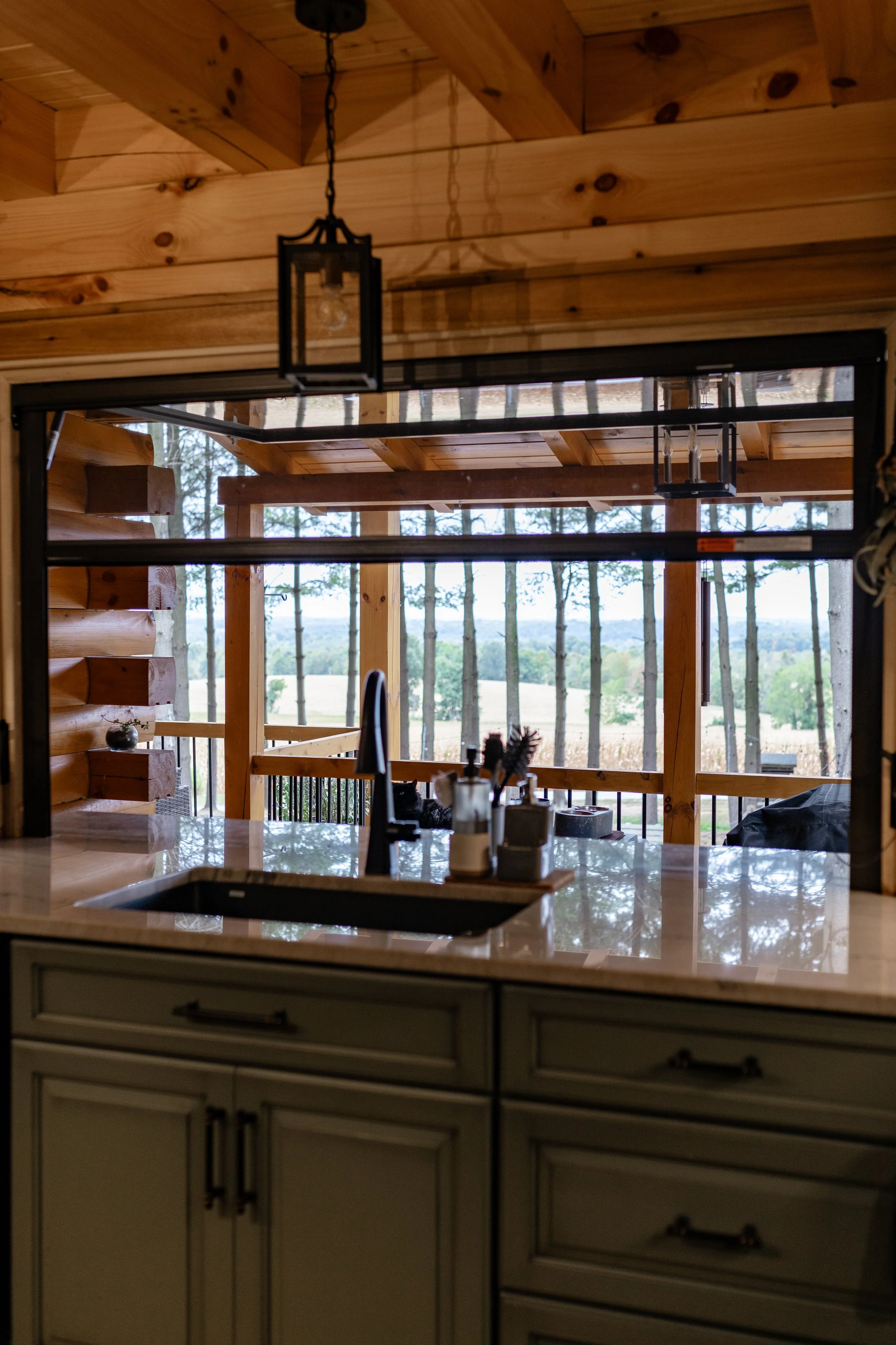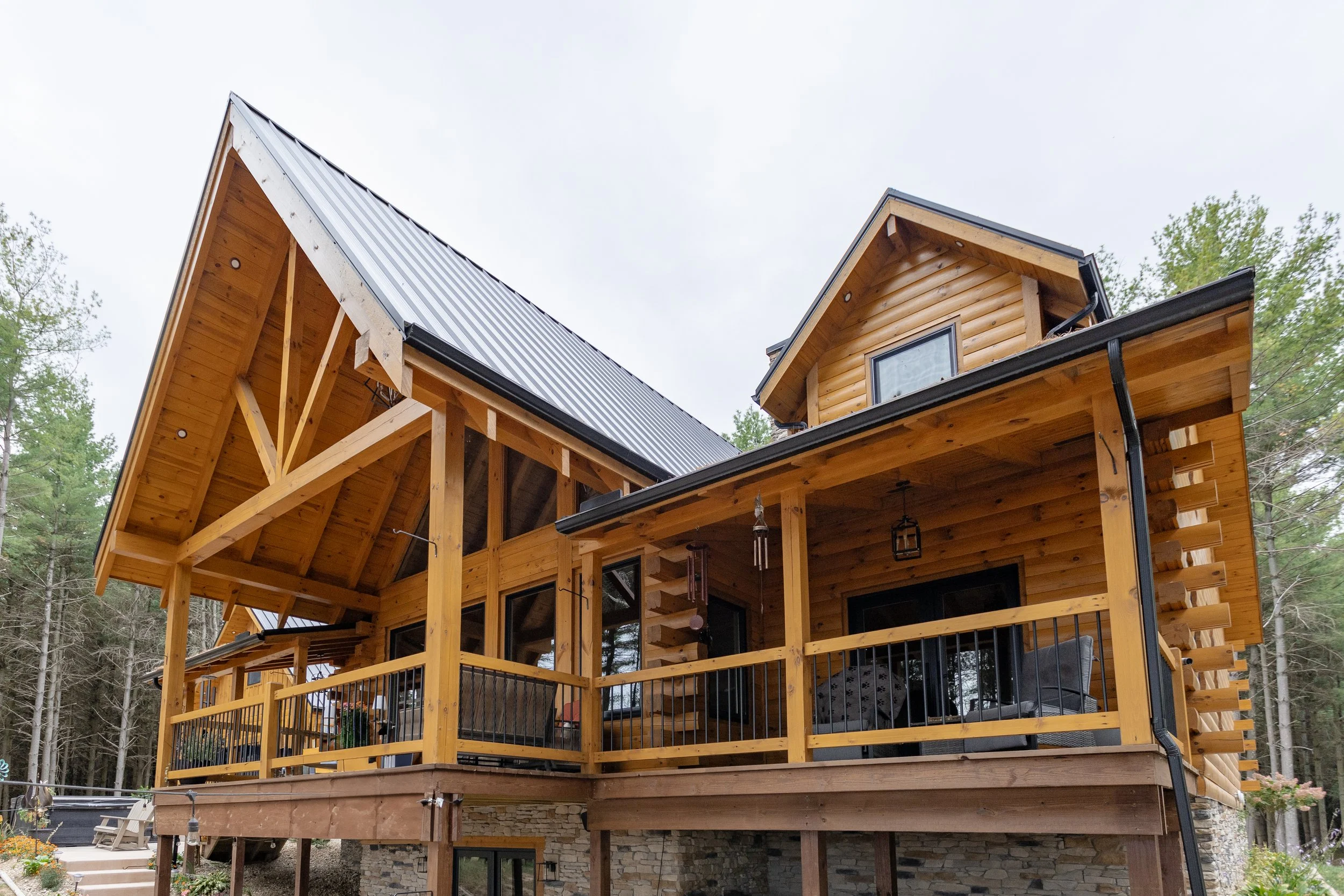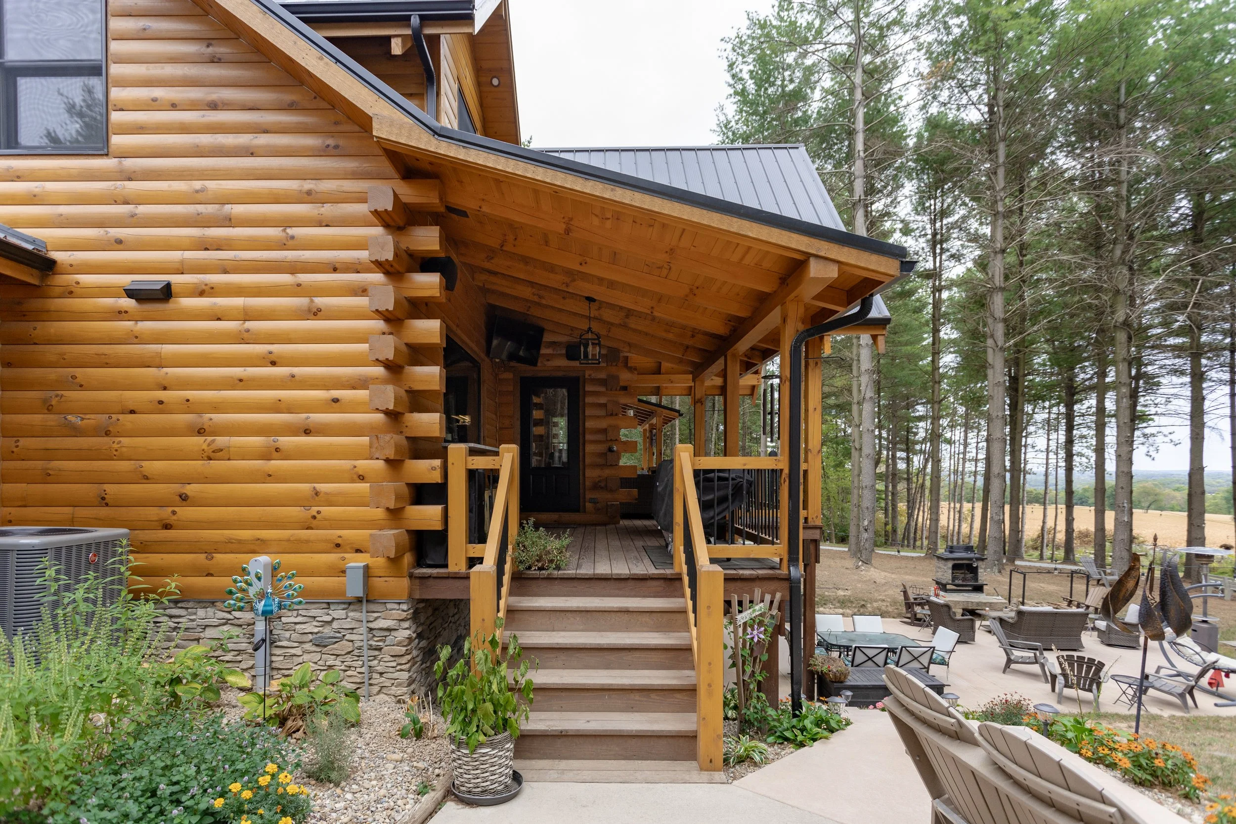 This stunning log home, built in a grove of pine trees, was built with 8” x 8” milled D eastern white pine logs. The home features beautiful exterior stone work, a large covered gabled porch with shed porches on either side, and plenty of unique finishes.