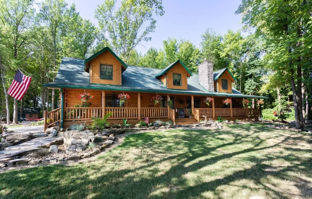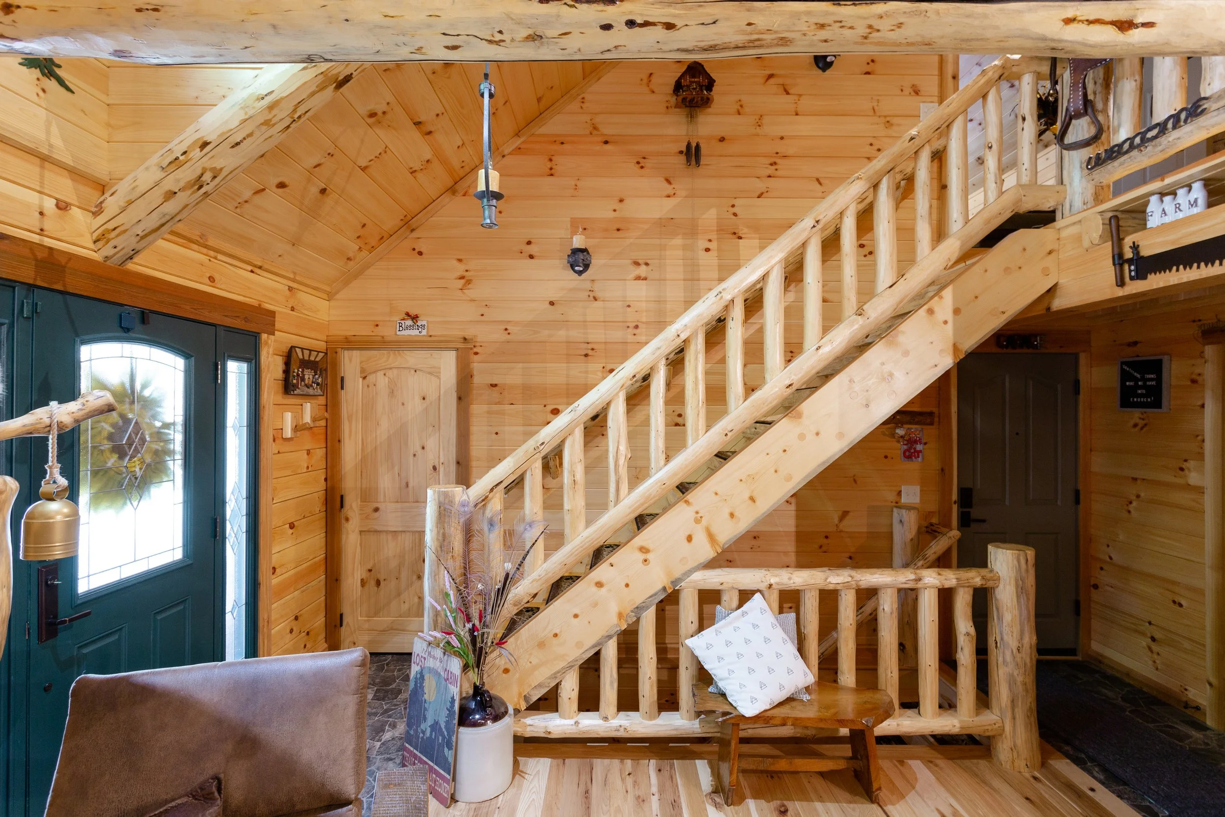This little Sliver of Heaven sits encompassed in gorgeous trees on the most perfectly landscaped piece of land. This custom log home is built with 6" x 8" Eastern White Pine logs, but the interior incorporates a more rustic log for the rafters, joists and railing.
